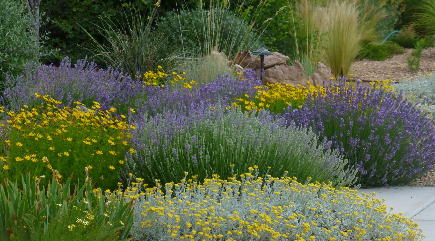 Lavandula angustifolia (English Lavender ), Tickseed (Coreopsis), Partridge Feather (Tanacetum) and Silky Thread Grass (Nasella)
