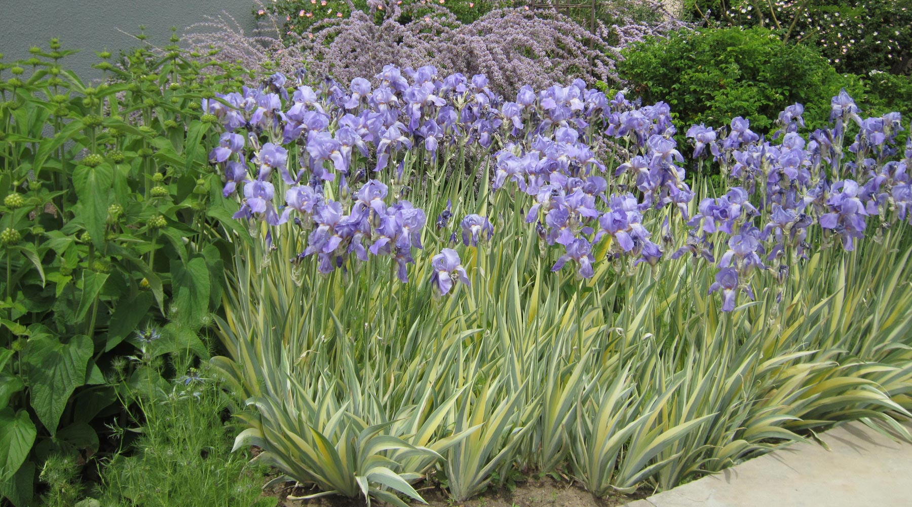 To complement your colorful bearded Iris flowers, it's advisable to plant other flowering perennial companions that bloom in late spring and enjoy drier soils and full sun.