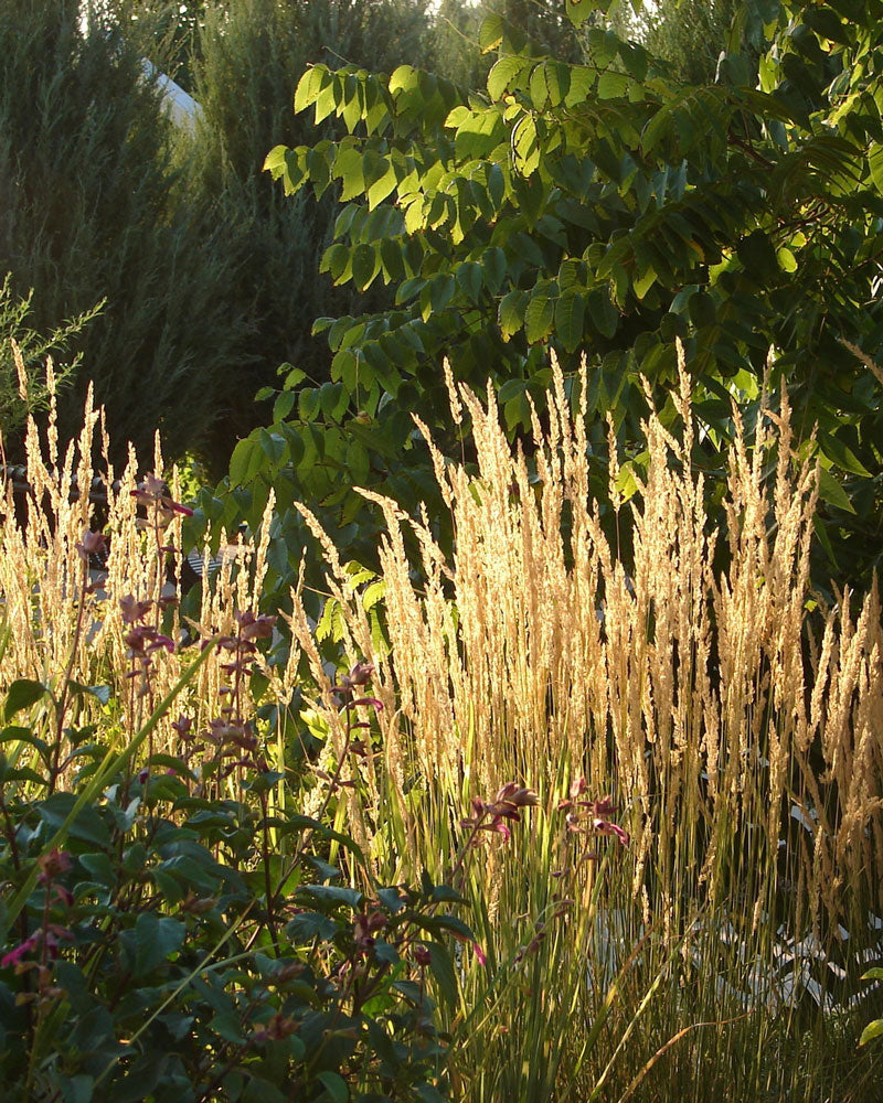 The Spring garden usually consists of smaller growing plants; those that wake up early, grow and bloom with the cool conditions of the start of the growing season. The fall is the time for the big plants to take center stage, having had the whole summer to reach flowering size. Many of the most dramatic plants in the late season garden would have to be the ornamental grasses. With their large size and interesting flowering spikes, these grasses have no equal when it comes to reflecting the glow of sunlight late in the day. And the grace of their swaying stems in the slightest breeze brings movement to the landscape.