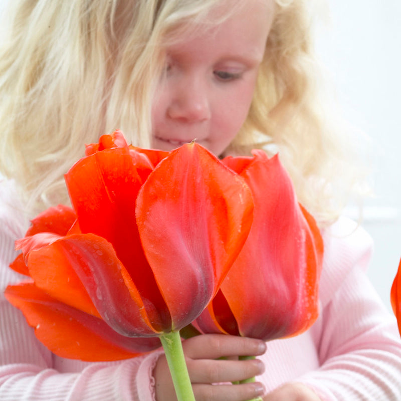 'Casa Grande' Rock Garden Tulip is an award-winning Greigii tulip known for its oversized, vibrant red blooms and distinctive patterned foliage. Flowering early in spring, the silky, tomato-red petals open to reveal a dramatic dark center, creating a bold focal point in beds, borders, and rock gardens.