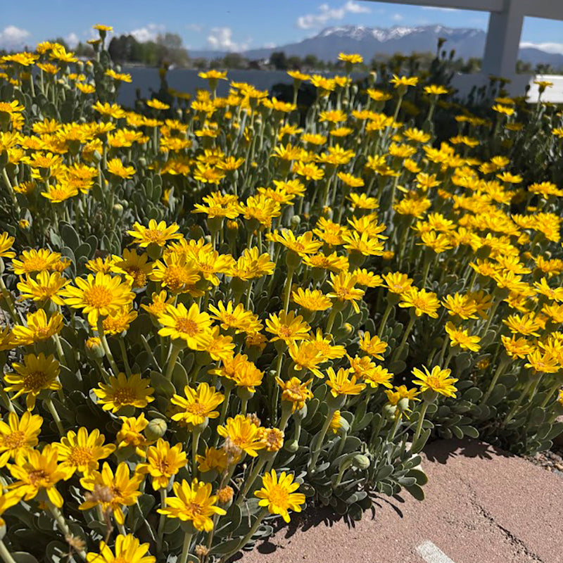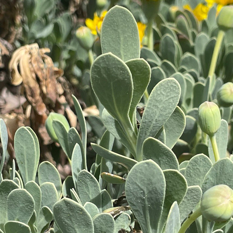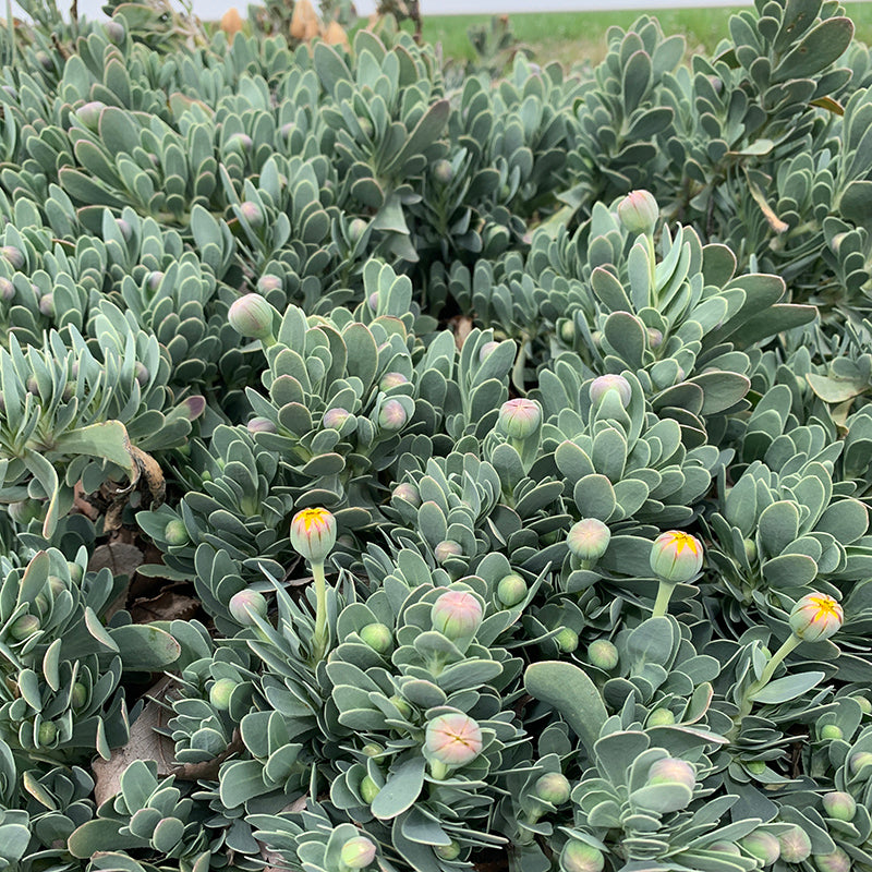 Barbary Ragwort, a fantastically strange succulent, was previously sold under the name Othonna, a name which seasoned gardeners may recognize. Bright yellow, daisy-like flowers are the calling card of this surprisingly cold hardy African plant. Even out of bloom the plant is eye-catching, with waxy, blueish green, oblong leaves. Mature plants can become substantial and take on a mounded form that complements their leaf architecture. To maximize cold-hardiness, taper off watering to these plants as fall nights grow cool and grow them with a gravel mulch on a south-facing berm. A spreading habit, low growth, and penchant for dry sites make this a good plant for erosion management, crevice gardens, and rock gardens.