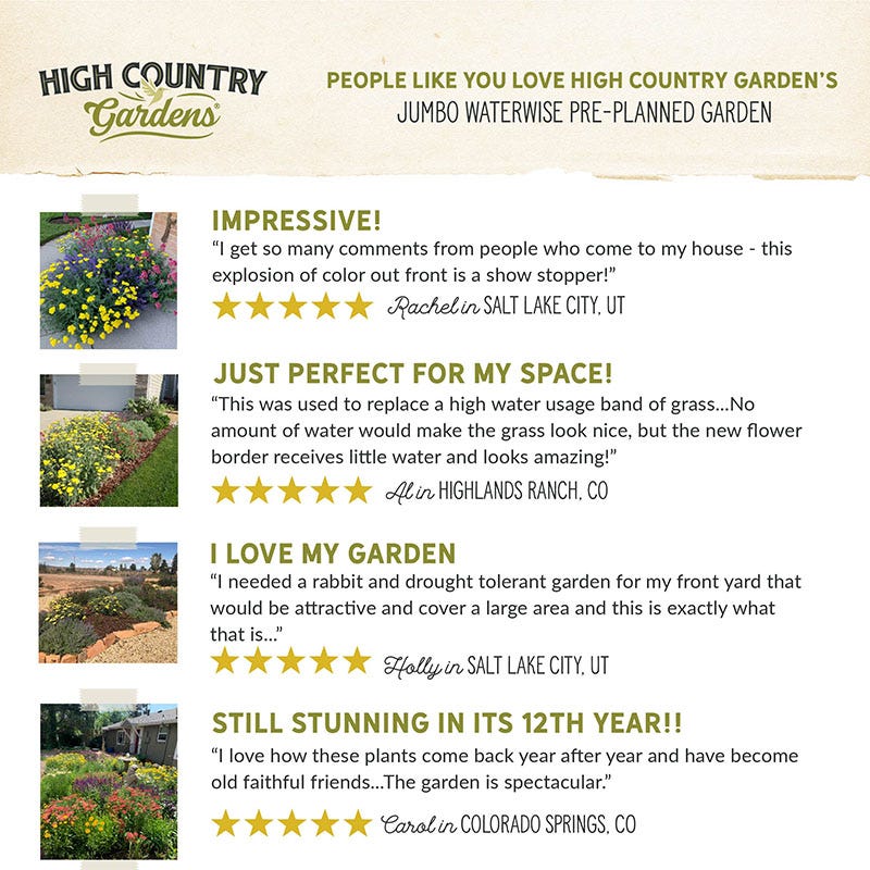 Our Jumbo Waterwise Pre-Planned Garden has been a bestseller for decades! Perfect for hot, dry, sunny gardens, this eye-catching combination of long-blooming perennials will light up the landscape with bright, clear colors. Grow more flowers and foliage while using less water. Easy-care plants feature inedible foliage to keep rabbits and deer away. Large garden of 27 plants covers 190 sq ft, small garden of 18 plants covers 100 sq ft. This Pre-Planned Garden comes with a garden layout map to make planting easy. (For gardeners in coastal CA, OR, and WA, plant the Jumbo Waterwise Pre-Planned Garden For The West Coast)