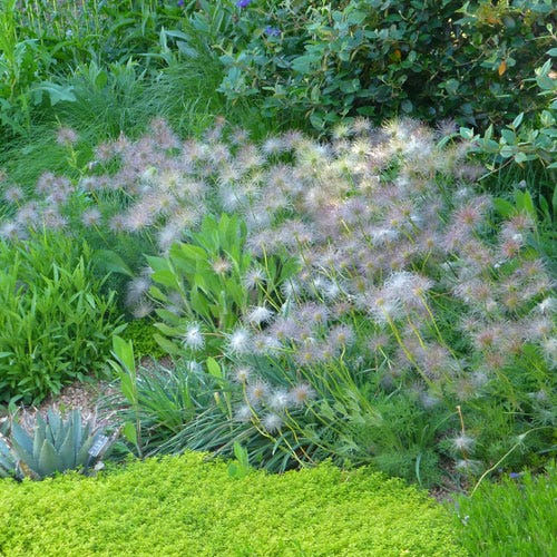 Pulsatilla vulgaris (Pasque flower) has dazzling blue-purple flowers and light-catching, fuzzy seed heads that make this European wildflower a delight in the garden. An early spring bloomer, its huge provide essential early season nectar for honeybees. Plant with daffodils. 12" tall x 12" wide.