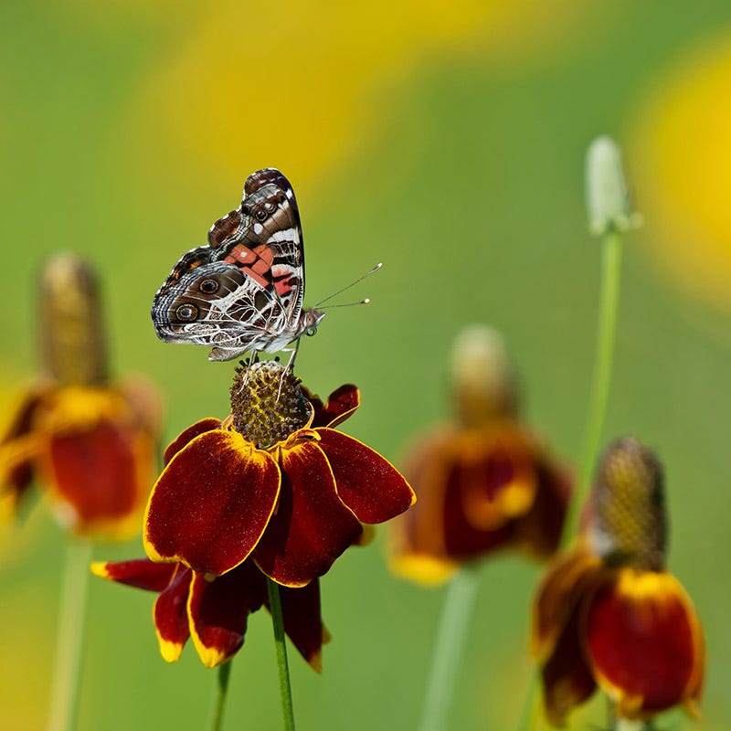 Ratibida columnifera (Mexican Hat) is the mahogany-red colored form of Prairie Coneflower that blooms from mid-summer into fall. A good naturalizing wildflower, it attracts bees and butterflies. 15-24" tall x 18" wide. Drought resistant/drought tolerant plant (xeric).