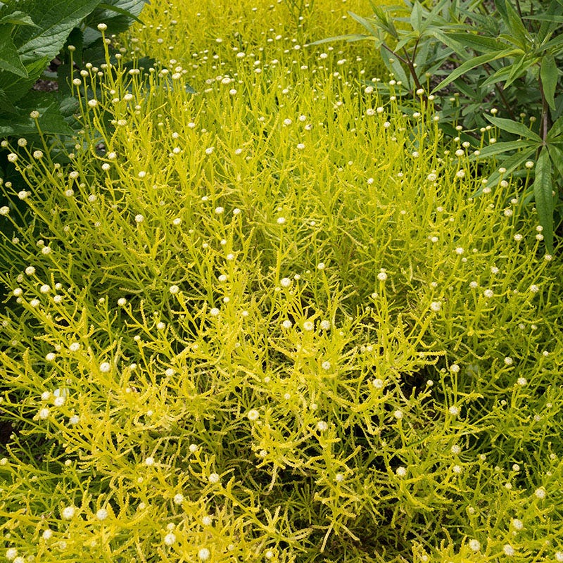 This eye-catching Santolina has bright yellow thread-like evergreen leaves and bright yellow button-shaped flowers in late spring/early summer. 'Lemon Fizz' Santolina (Santolina virens) thrives in full, hot sun, but demands a sandy, dry growing site once established. Away from the West Coast, which is its favorite planting region, it is recommended as a container-grown plant for use around the patio. Plant in a sunny border, a stylish container, or in a rock garden. Suitable for green roofs and mass planting. Plant with Sea Thrift (Armeria), Pinks (Dianthus), and Sedum (Sedum). Other perennials that work well with it in containers are ornamental grasses like Blue Fescue Grass (Festuca), Yarrow (Achillea), and ‘Red Devil’ Verbena (Verbena).